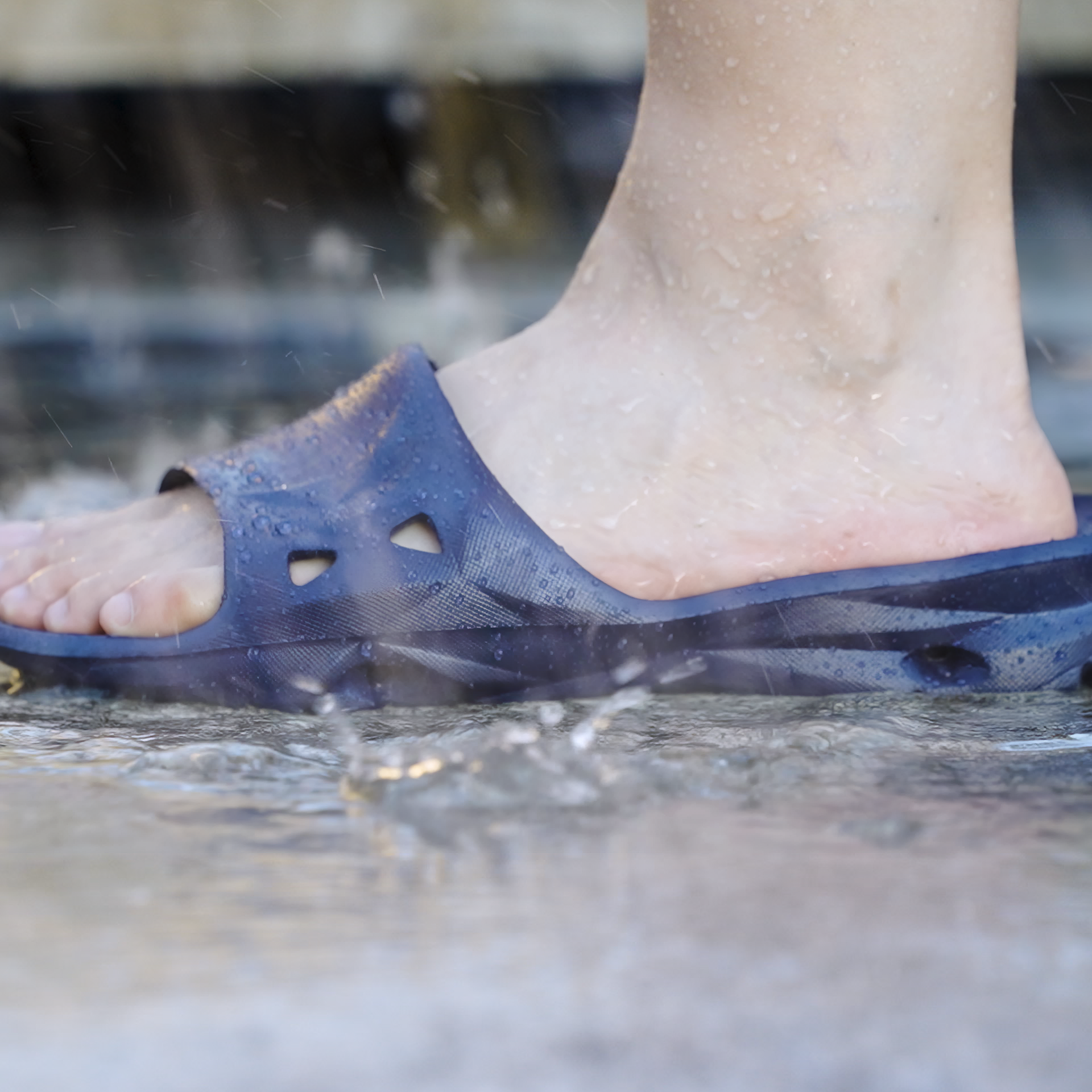 我們採用幾何排水溝槽設計,迅速排出鞋內積水,確保足底-鞋面保持高摩擦力,穿著好孜排水拖鞋洗澡,更加穩定安全,遠高於光腳/一般拖鞋。